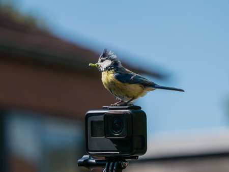 House sparrow chick sitting on a camera calling for food