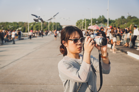 Beautiful asian woman talking picture of seascape and birds in Bang pu seaside, Thailand.