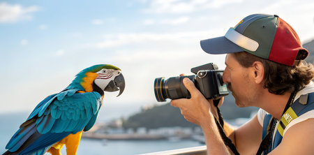 A photographer aims their camera at a vibrant blue and yellow macaw, capturing a detailed portrait against a beautiful, sunlit coastal landscape.
