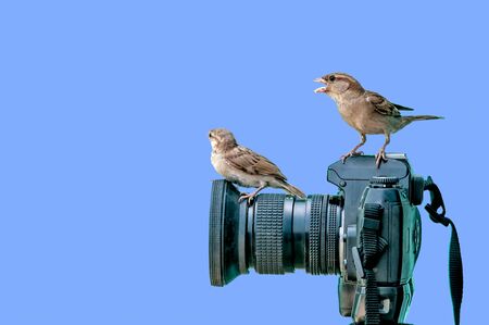 A bird sitting on a camera. Space for text
