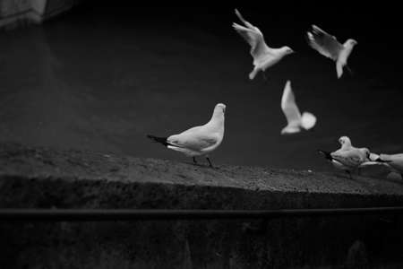 Doves taking off and flying away from on a railing in the riverbed of the river Rhine in Bonn
