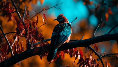 AI Generated. A Colorful Bird Perched on a Branch Surrounded by Autumn Leaves in a Forest