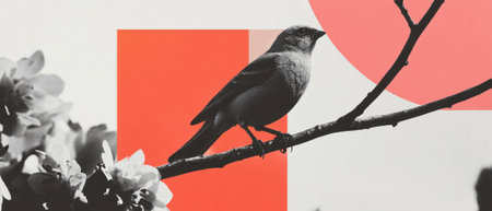 Minimalist collage featuring a sparrow on a branch with geometric shapes and floral elements
