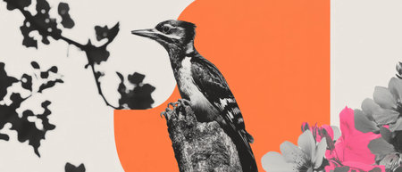 Collage featuring a woodpecker pecking a tree against a minimalist geometric background