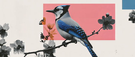 Minimalist collage showcasing a blue jay perched with a nut against geometric shapes