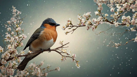 A small bird with soft plumage sits gracefully on a branch surrounded by blooming flowers, reflecting the beauty of spring.