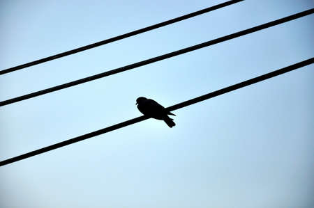 Single bird resting on cable against clear sky, highlighting freedom, balance, and natural tranquility