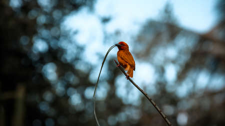 a bird perched on a red shelf, against a minimalist background in light teal and dark gray. the photo showcases photorealistic accuracy, with vibrant pops of light orange and sky-blue. the composition follows the stereotype of photography characterized by animals. this high-quality photo captures the beauty of the bird in its natural environment. ai generated
