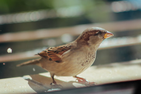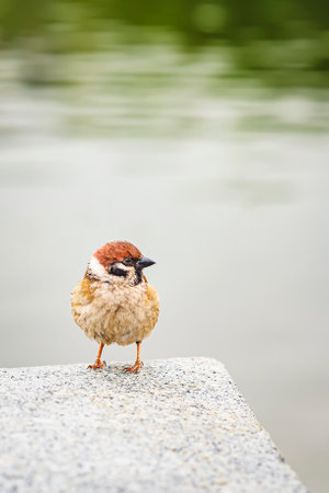 Fluffy sparrow stands on stone ledge near calm water with soft bokeh background, copy space. Concept of sparrow stillness, peaceful wildlife, and urban nature harmony