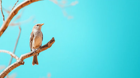 A small, brown sparrow perches gracefully on a bare branch, set against a vibrant, turquoise sky. The minimalist composition highlights the bird's delicate features and peaceful demeanor.
