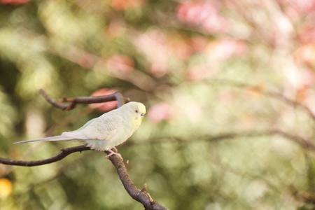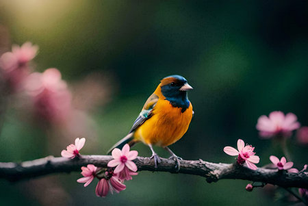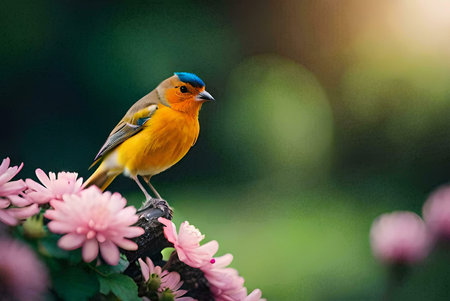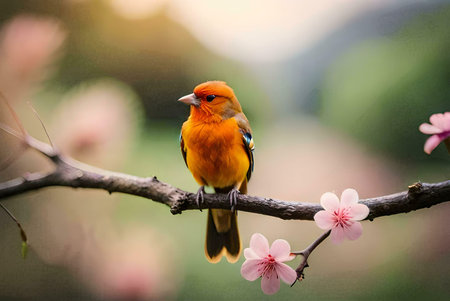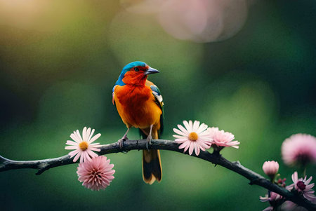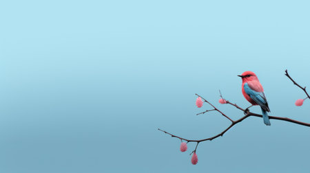a colorful bird perched on a branch, showcasing a minimalist background inspired by the sui dynasty. the light sky-blue and pink hues create a visually pleasing contrast. this high-resolution image in 8k resolution captures the essence of qian xuan's artistry, with its sparse backgrounds and delicate flowers. ai generated