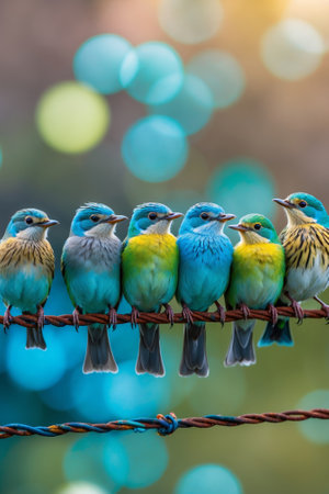 Vibrant blue and yellow birds perching on a wire against a colorful bokeh background in nature