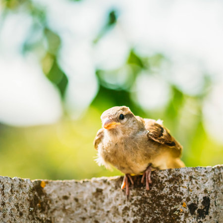 Young Bird Nestling House Sparrow Chick Baby Yellow-Beaked Passer Domesticus) Sitting On Fence