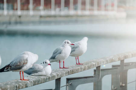 Seagull portrait in city. Close up view of white bird seagull sitting on a sea shore against a blue water. Wild seagull with natural background.