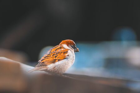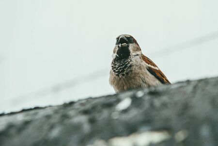 a small but formidable Sparrow sits on a concrete curb and opens its beak. Selective focus macro shot with shallow DOF