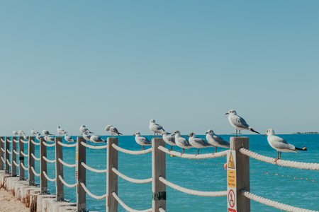 Seagulls perched along a rope barrier by the sea on a sunny day