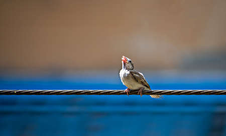 Newly born, hungry baby sparrow barely balancing on wire and awaiting for food from parents.