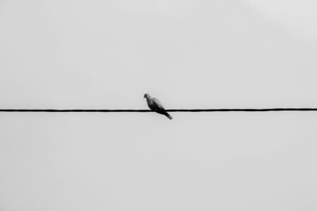Pigeon sits on an electric cable. black and white picture pigeon.