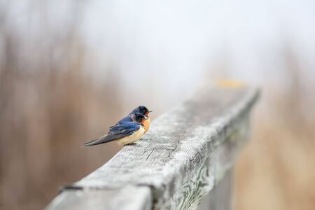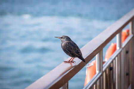 Color edited photo of small cute bird sitting on thr top of railing with sky an sea at background