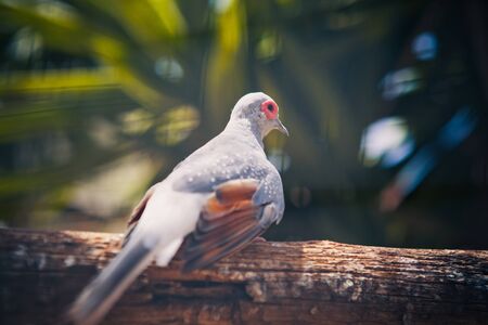 City pigeon sitting on wooden boards and resting basking in the sun.