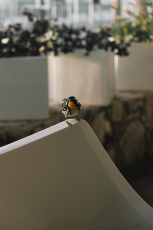 A vertical selective focus shot of a black and white bird with a yellow side perching on a wall