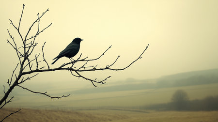 Generative AI Image of Starling Bird Perched on Barren Tree Twig with Hill View in Foggy Sky