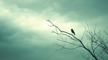 A solitary bird standing on a tree branch without leaves, looking out at the empty sky, photorealistic generative ai illustration