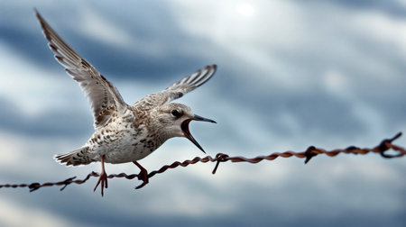 A stunning image of a bird gracefully soaring in the sky, capturing the essence of freedom and tranquility. The colorful wings spread wide against a serene blue background.