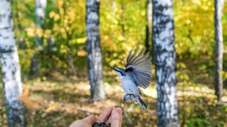 Small titmouse eating meal from arm of young girl against sunset at background. Little tomtit pecking food from a female hand at autumn. Woman feeding cute tit bird to sunflower seeds in forest
