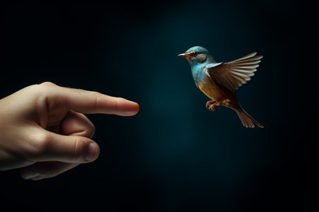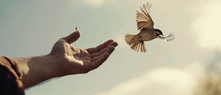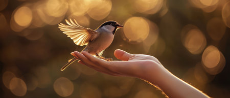 A bird landing on hand symbolizes trust and connection, illuminated by soft light, evoking quiet joy