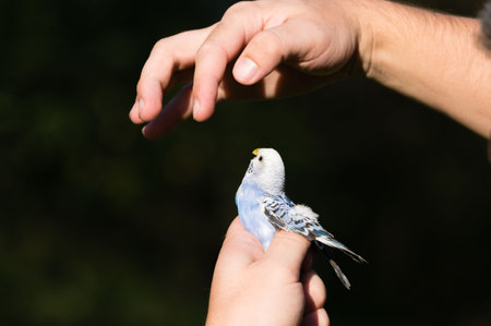 A close-up shows a person gently holding a pale blue budgerigar. The bird is perched on a hand, and another hand hovers above. The background is dark and out of focus.