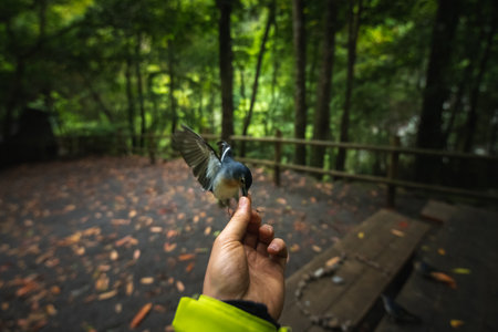 A selective focus shot of a hand feeding a great tit bird in the woods