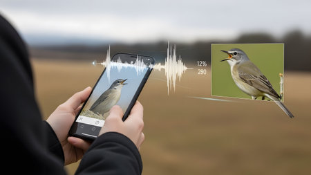 Identification showing hand holding smartphone displaying bird identification app with augmented...