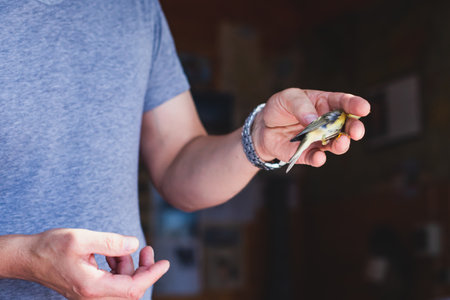 A peasant is holding a young bird of a sparrow fallen from its nest