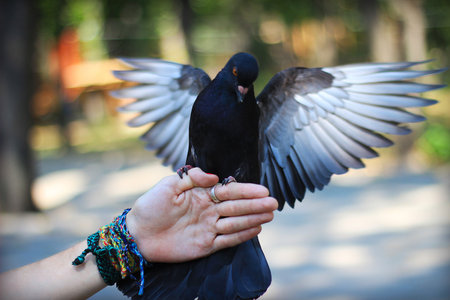 A closeup of a Eurasian magpie on a human hand under the sunlight with a blurry background
