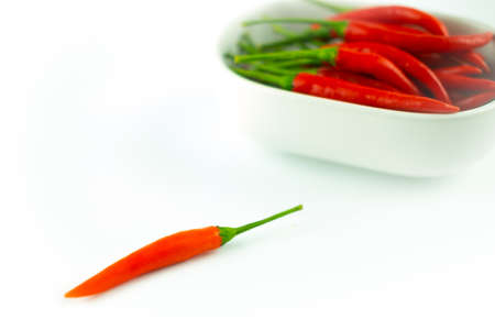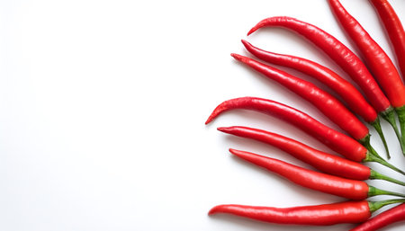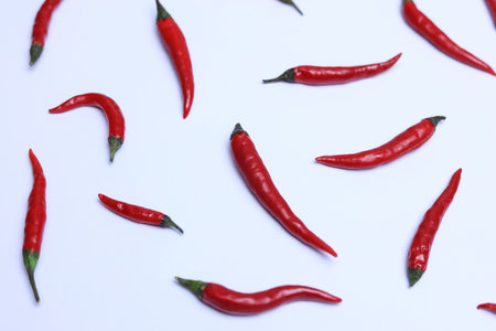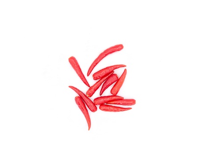 Red hot chili peppers arranging with white background and blank space. Garnish and food ingredients.