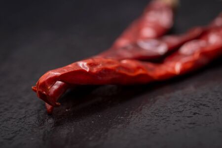 Dried Mexican Red Chile De Arbol Pepper on black natural stone background. Capsicum annuum.