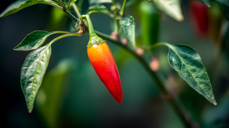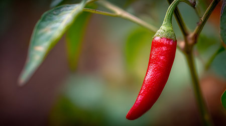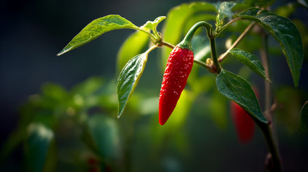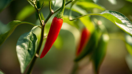 Vibrant red chili pepper growing on a plant, with leafy green backdrop