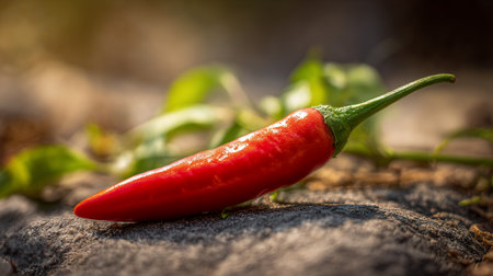 Vivid Red Chili Pepper Resting on a Rustic Stone Surface Outside