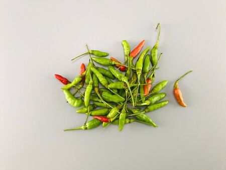 Red fresh peppers and green fresh peppers placed on a gray background