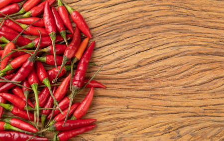 Red chilli peppers over wooden table with copy space.