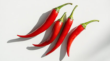 Isolated image of red chili with dramatic shadow on white, creating visual depth and focus on spicy detail