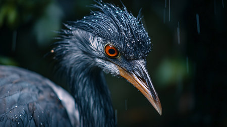 Bird with wet feathers and an orange beak. The bird is looking at the camera. The image has a moody and mysterious feel to it