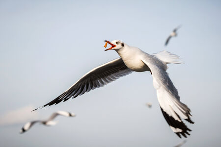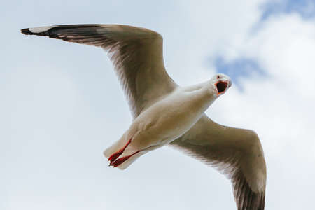 Flying shouting Kelp gulls (Larus dominicanus), also known as the Dominican gull and Black Backed Kelp Gull. Blue sky background. False Bay, South Africa