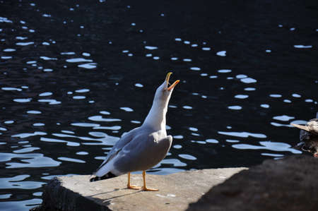 Seagulls open beaks and screams and looking for food on sea waterfront. Rippling water washes asphalt alley at bright sunlight in summer closeup