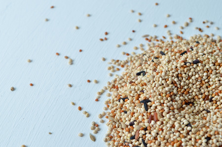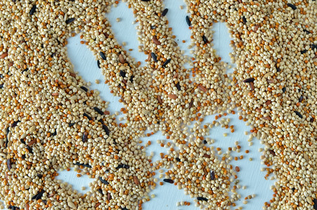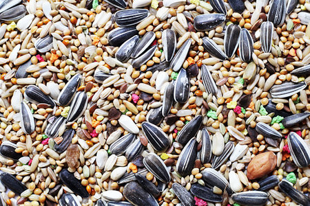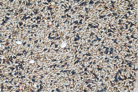 Detail of mixed seeds used in a feeder bird. Seeds of various species for cage and wild birds