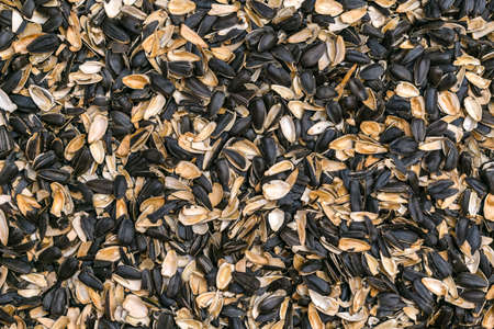 Sunflower shell seen from above. Pile of sunflower seed shells for texture or background