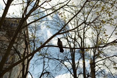 Crow sits in tree. Bird on branch. Black raven against sky.