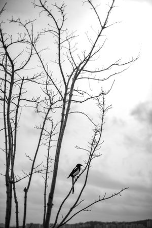 black and white urban nature: Crow perched on bare tree branch