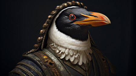 a bird in a black costume with a beak and crown, resembling the style of zbrush, is depicted in dark white and orange colors. the portrait showcases hyper-realistic and highly detailed features, reminiscent of the northern and southern dynasties. the photographically detailed portraitures capture eccentric detail placements, creating a visually captivating image. this artwork can be found on sketchfab. ai generated
